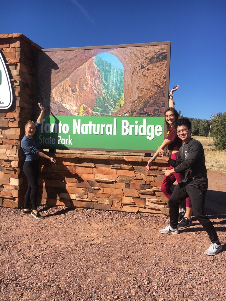 So the original plan for this day was actually supposed to be a road trip to the Four Corners! The night before our road trip, I was hanging out in Rita and Lexi’s room making a bucket list of all of the places I wanna go to while in college. Making the bucket list got me really excited to start checking places off! We started brainstorming ideas of where we could go the next day. Our first thought was driving to the Four Corners, so we called my friend Ethan up to see if he’d be down, but he didn’t answer. We kept thinking about the Four Corners and realized it probably wasn’t worth the drive because we weren’t sure what would we’d actually do once we got there. Maybe jump on the Four Corners and then run from state to state. But what else? Since it was a 6 hour drive and we didn’t have any other activities planned, we decided to change our destination. Don’t get me wrong, we totally would’ve drove 6 hours to only get out and hop on the corners and head back, but we felt like we could do something better with our time and save the trip to the corners for when we have other activities planned! Eventually we decided on going to Tonto Natural Bridge in Payson, AZ!