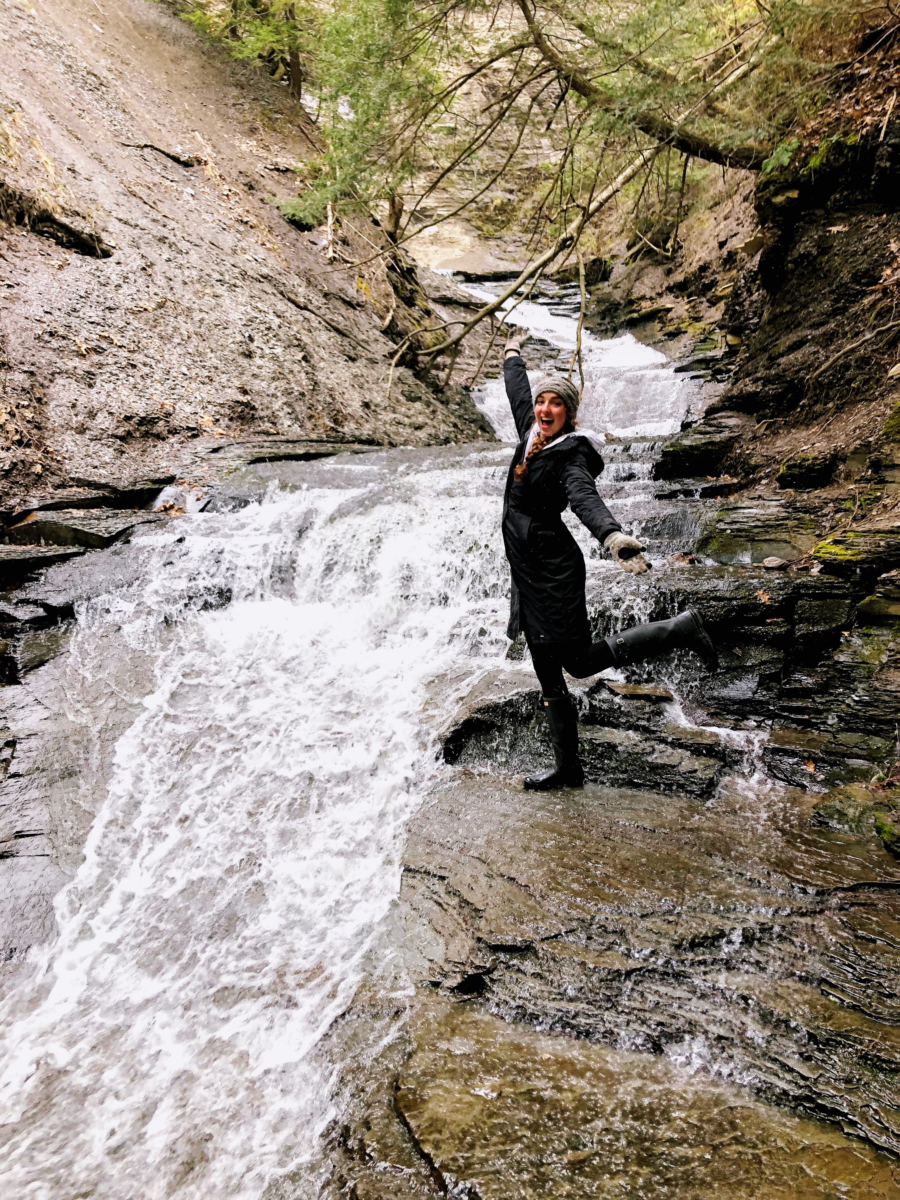 Following our lunch break, we decided to find what we came here for, waterfalls! I’m super glad I was wearing my Hunter Boots for this day. Not only did it help keep my legs warm during my hike, but I was able to walk carelessly upstream without worrying about stepping in too deep of water. My dad, on the other hand, was wearing duck boots so he had to be more careful. Despite our differences in footwear, we were both able to make it to the beginning of the waterfall! This trail was a lot easier than the hike up the mountain. It was a lot of fun navigating our way upstream, we were jumping on top of logs and limbo-ing underneath them to make it through! Below is a picture of the waterfall at the end!