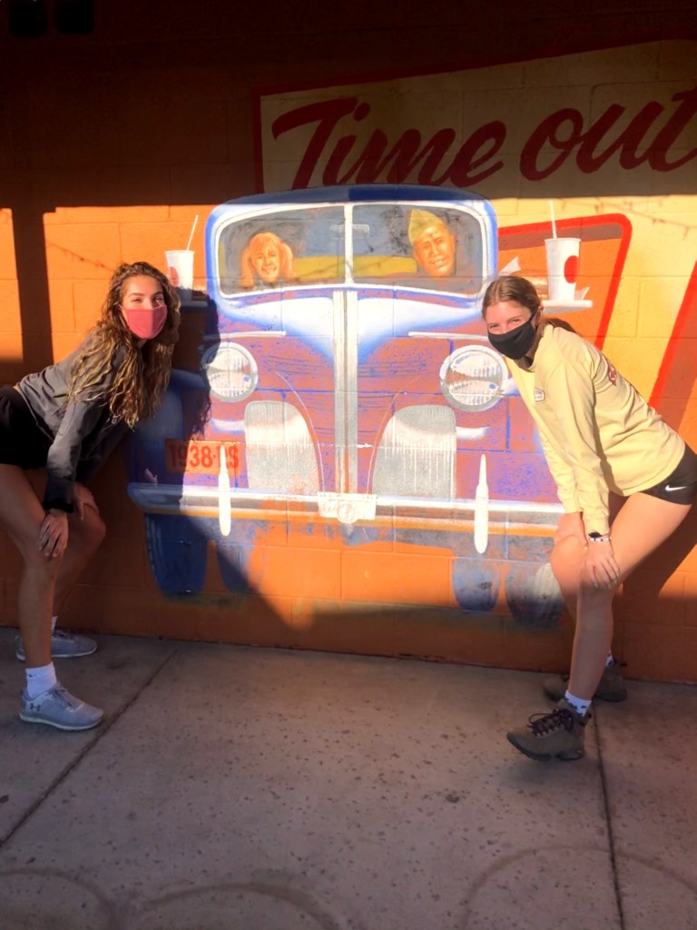 On the way there, we had all chugged coffee and rebels from Dutch, so we took a pit stop at a cute little gas station in Black Canyon City. They had a few different murals on the buildings, so of course we took some pictures in front of them!