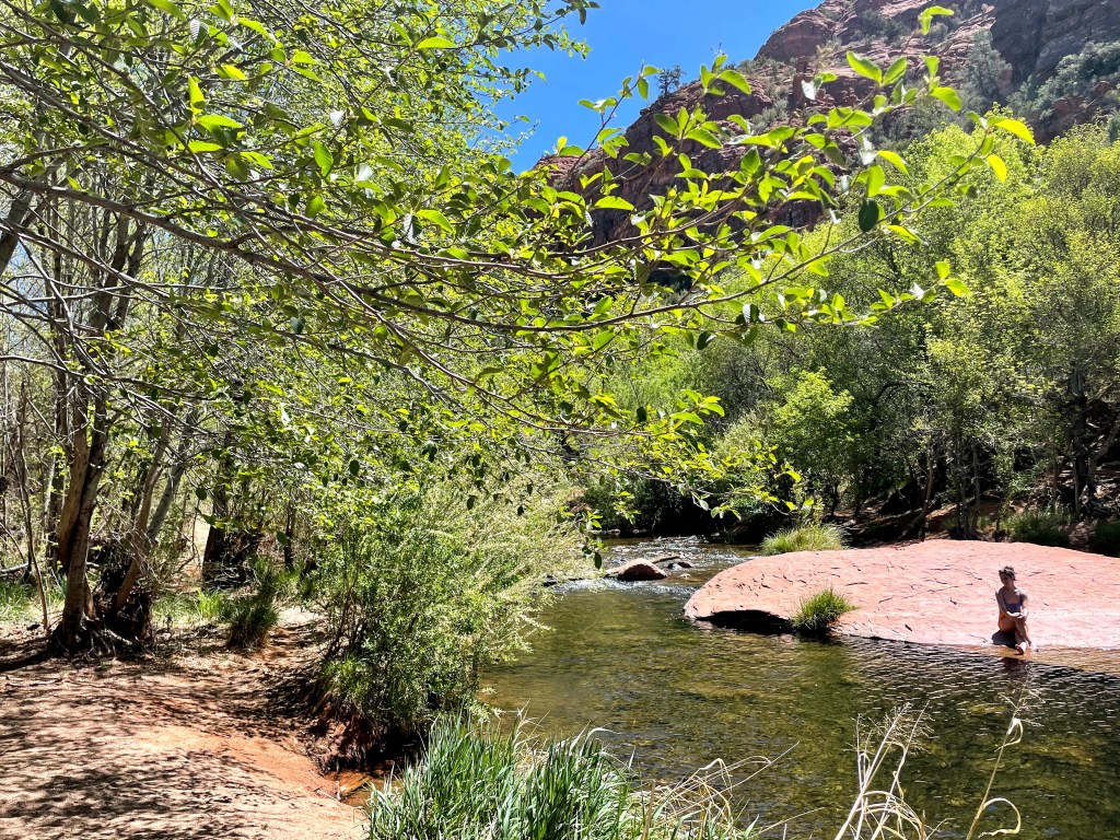 When we headed back down, we set up our picnic at this little beach we found (still not Buddha Beach yet). It was a quaint little spot that had views of the red mountains of Sedona in the distance. For our picnic, we had cinnamon raisin bagels from Trader Joe’s with peanut butter and an assortment of jams left over from our charcuterie board picnic we had a few weeks prior! It was sooo tasty and also so peaceful to have lunch by the creek. I highly recommend this!