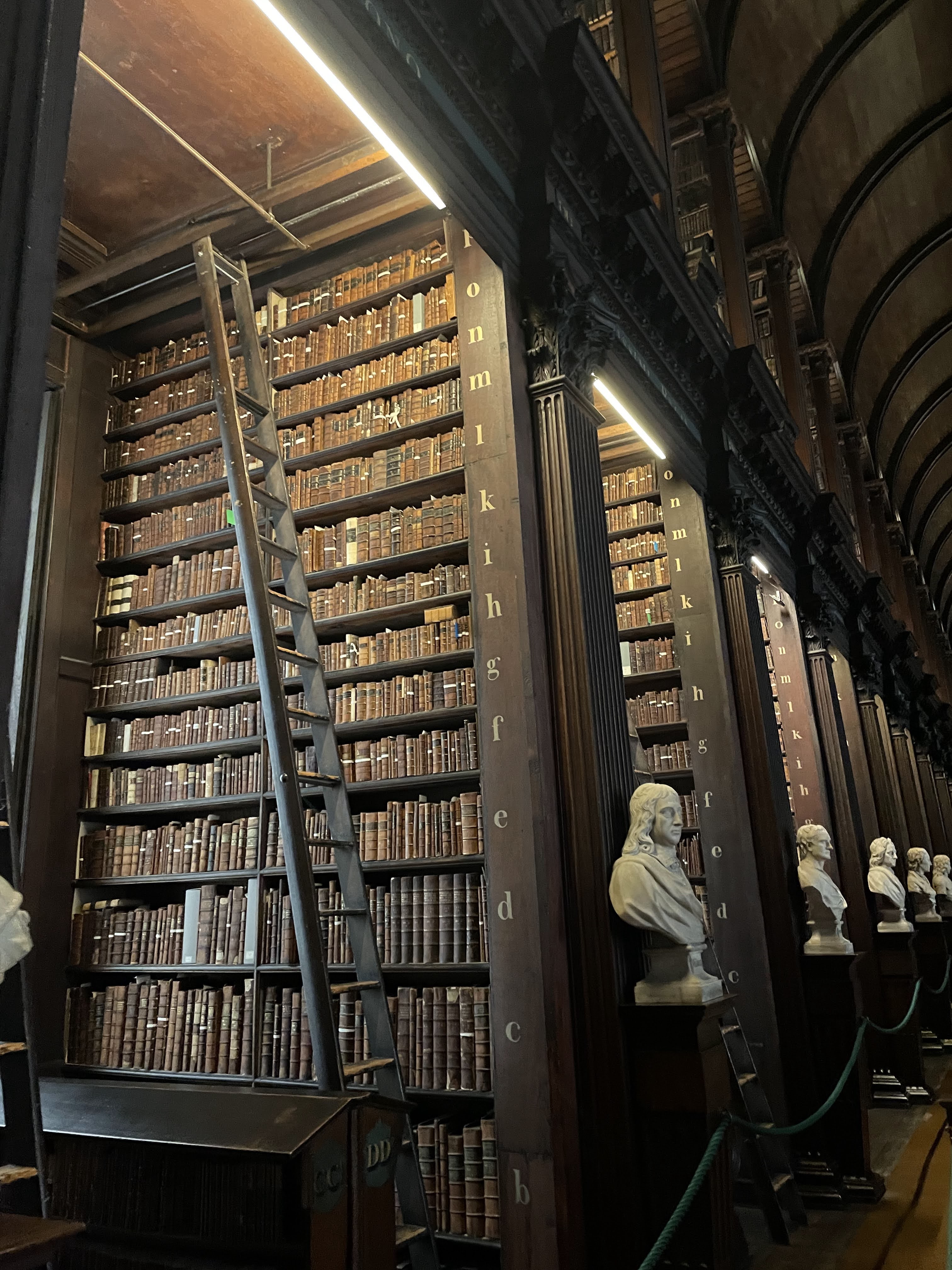 After the Book of Kells, we entered the Long Room at the Library of Trinity College. This library took 20 years to complete, beginning in 1712, and now contains over 200,000 of the Library’s oldest books. Fun fact: the Long Room holds one of the last remaining copies of the Proclamation of the Republic of Ireland and also the Trinity College Harp, which is the oldest Brian Boru harp, made in the 1500’s, and is one of the symbols of Ireland and Guinness beer.