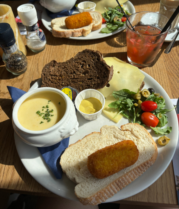 We all had their taste of Gouda lunch plate called “Gouds trio – kaassoep, kaaskroket en broodje Goudse boeren belegen”, which is the first option under the section “Warme lunchgerechten” or “Hot lunches“. This meal comes with a Gouda trio cheese soup, a croquette, and a Gouda farmer’s sandwich with mature cheese.